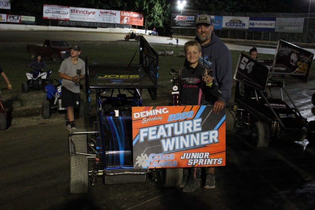 In a main event plagued with stoppages, Drake Hadlock made a last lap pass to win his second feature of the year in the Clean Crawls Junior Sprints and in the process, almost assuredly locked himself in as top point for the weekend in the division. Hadlock came from 18th to pass Ryan Bright on the last lap to take the win. The second place for Bright was his best Deming Speedway finish, with Cooper Anderson taking third.