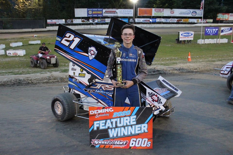 Cejay Adkins appeared to be on his way to his first victory at Deming Speedway in the Mytrafficman.NET 600 restricted class, but Corbin Ramsey had other plans. With multiple restarts held over the 25 lap A Main, Ramsey went to school and found a hole in Adkins defense on the low side of turn. With a restart coming at the start of lap 21, Ramsey found great forward drive and pushed past Adkins low, starting a chain reaction that saw Corbin gap teh field for his first Deming Speedway win and saw Adkins drop out of the top three, as Jesson Jacobson and Levi Kuntz both got by in the last few laps.